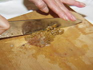 ![]() 続いては、古崎店長にバトンタッチして、つぶの仕込み(貝から身を取り出す)からお造りの作り方を勉強します。詳しい身の取り出し方は前回の模様をご覧下さい。 「メウチを使う時はくれぐれも怪我をしないよう注意して下さい。」と、注意点を話され、古崎店長が実演! それでは、皆さんにも身の取り出しを実戦して頂きましょう。 皆さん、馴れないメウチを使ったつぶの穴あけに悪戦苦闘しておられました。 なかなか穴が開かない硬いつぶの殻に、メウチを両手で持って殻を叩く方や、手をかなづちのようにして叩く方など様々。 中にはメウチの先端が自分の手の方向に向いていて、古崎料理長が慌てて「それはダメダメ!」と、丁寧に指導されていた方も・・・。 |